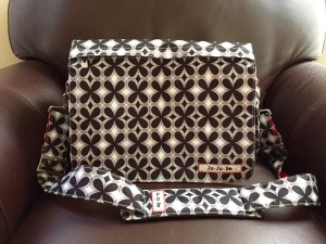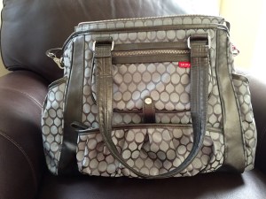 The last bag is covered in a playful black, white and red design. It is made from a waterproof material and is designed to take a beating. This is my diaper bag and it contains much more than diapers and wipes. In this bag you will find an extra set of clothes, a bib, toys, snacks, a sippy cup, Boogie Wipes and those plastic disposable placemats the baby eats off of at restaurants. This bag has built in crumb holes at the bottom to easily clean out the random Cheerios and Goldfish Crackers that have found their way to the bottom of the bag. The bottles I used to carry in this bag have been replaced with organic baby food pouches. It isn’t overly feminine looking and my father in law feels comfortable carrying this bag when he babysits.
