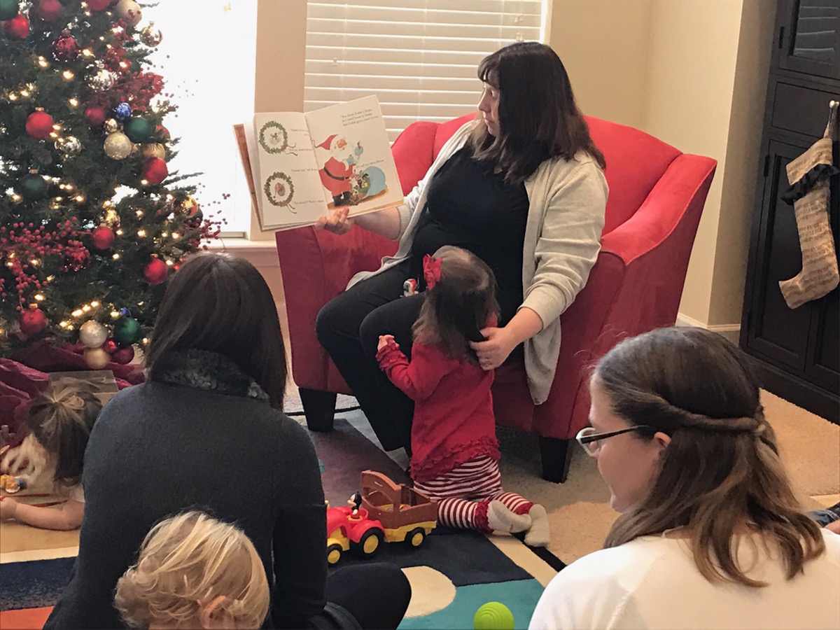 This year I shared the story of Santa Mouse with Lillian and her friends. A few days before Christmas I hosted a Christmas party for the “library girls.” Feeling rather brave, I invited eight two-year olds over for a Christmas themed play date. I wish I could say I handled all eight by myself but I need to add that their mommies were also invited. After feasting on bagels and fruit, playing with cinnamon scented play dough and coloring Christmas images, I invited everyone to sit around the Christmas tree in our great room and I began reading the book, “Santa Mouse.”