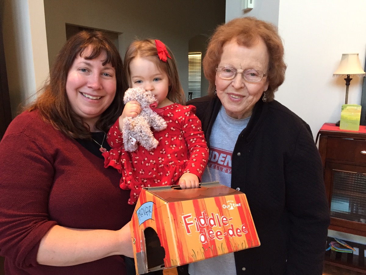 A few hours later the doorbell rang. We were surprised to find Ms. Shirley at our door! She was carefully carrying a red paper bag and after inviting her inside she gave Miss Lillian the mystery package to open. Lillian’s face lit up and a huge smile emerged on her little round face when she discovered her beloved Sweetie Pie inside. She took the stuffed dog in her arms and gently pressed it to her face in a loving embrace! Thanks to Ms. Shirley and her remarkable act of kindness, girl and pup have been happily reunited. It was the sweetest gift our Miss Lillian has ever received.