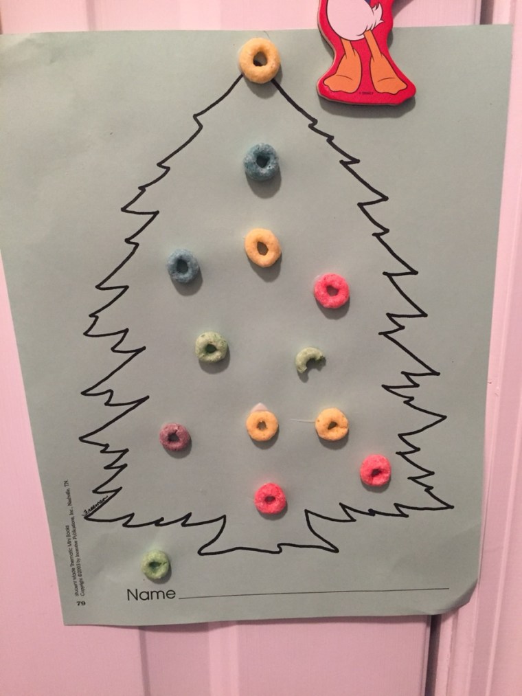 We decorated paper trees with colorful Fruit Loop ornaments. Although I think more of the Fruit Loops ended up in their tummies then on the trees!