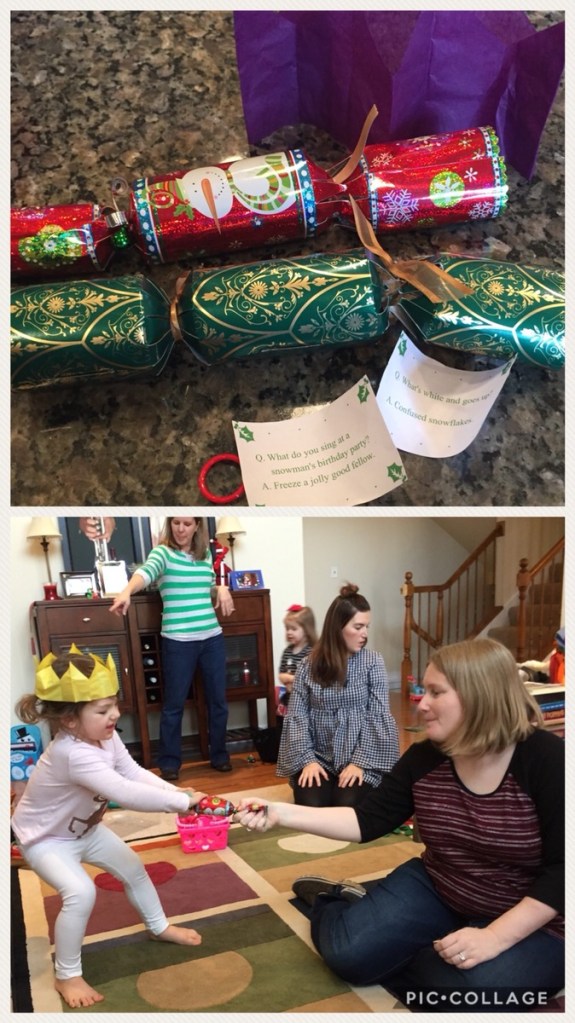 Chelsea, one of the “library moms,” brought festive “crackers or poppers” and shared how they are a Christmas tradition for her daughter’s grandmother who has British relatives. The “cracker or popper” is pulled apart by two people and out pops a small toy, a joke and a paper crown. The littles really enjoyed the treats and I took their picture wearing their Christmas crowns.