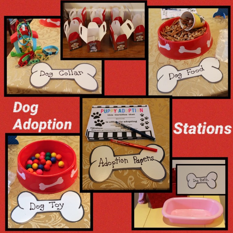Each party guest got to “adopt a dog” to take home. After selecting a dog the girls went through the dog adoption stations. I purchased the stuffed dogs and most of the supplies for the various stations through Oriental Trading.