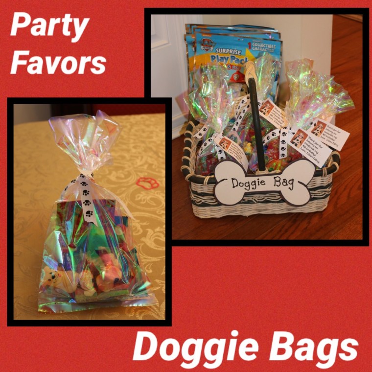 Doggie Bag- Upon leaving, each guest took a “doggie bag” home filled with toys and treats. I purchased dog finger puppets and puppy party notepads from Oriental Trading. Other goodies included a sucker, dog stickers, a small Paw Patrol coloring book, Paw Patrol fruit snacks and dog bone shaped graham crackers.
