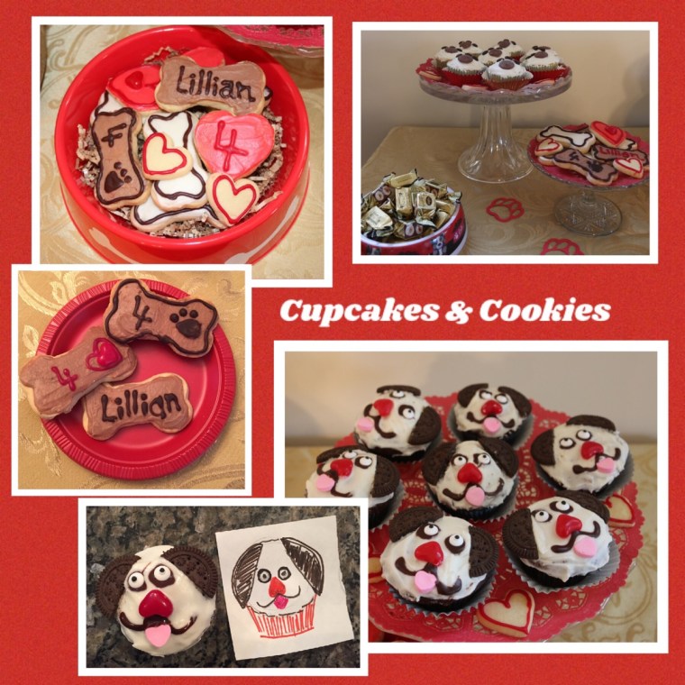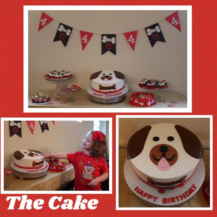 The Decorations- My dad helped me make birthday banners in the party colors; red, white and black. I used the Cricut Machine to cut out bone, paw print and number 4 shapes and used them to decorate the banners. The banners were hung above the dessert table and throughout the house.