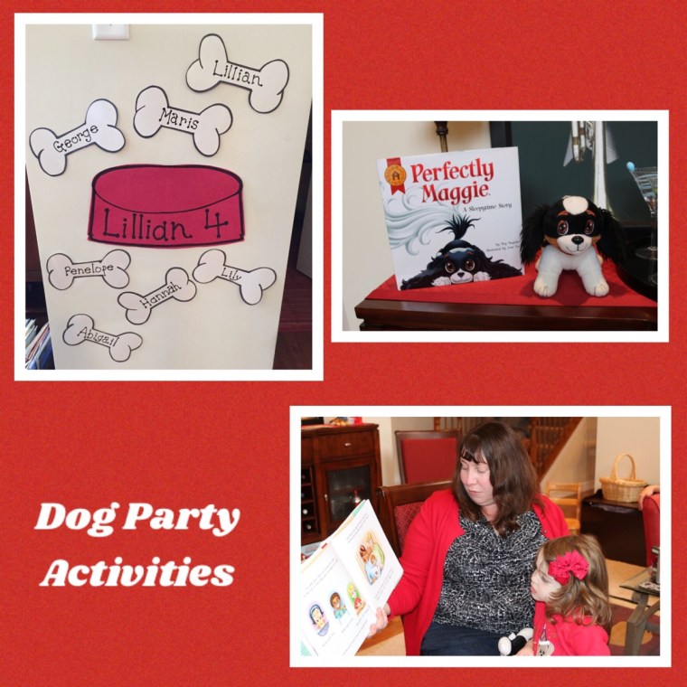 Games & Activities- We played the game “Put the Dog Bone in the Bowl.” My dad drew a giant dog bowl and while blind folded the girls took turns trying to be the closest to place the dog bone in the bowl. We colored dog coloring pages and the girls enjoyed dancing to the song “Who Let the Dogs Out” and listening to a story about a dog named Perfectly Maggie. After the story I explained how they were going to adopt a dog to take come.