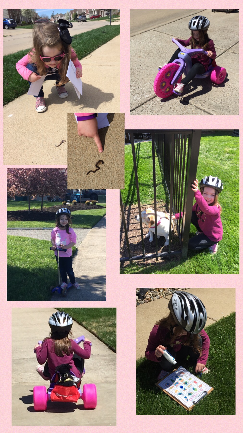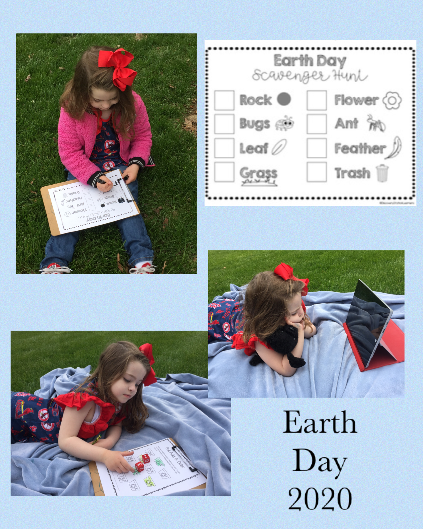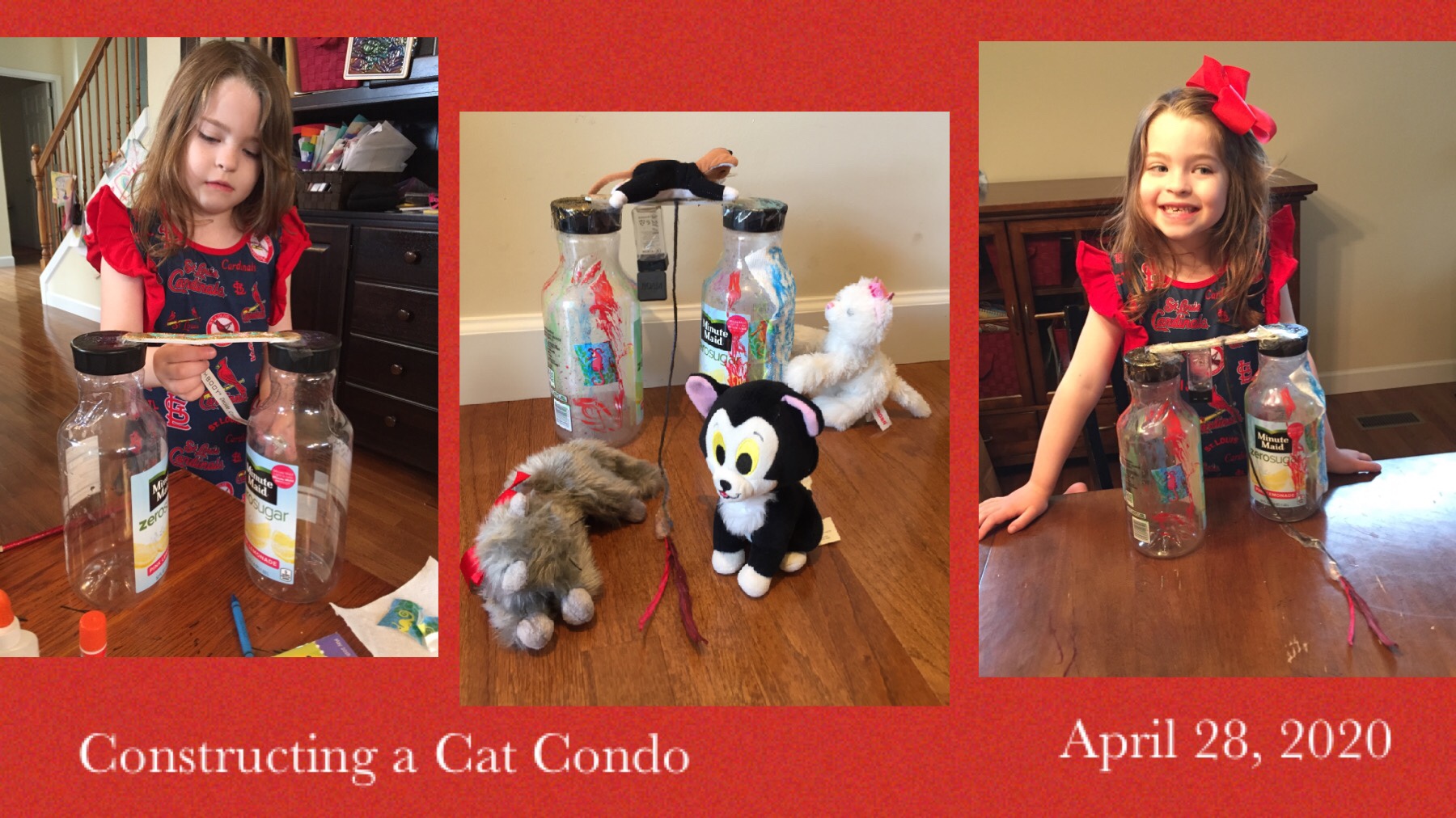 Constructing a Cat Condo– Although I had plans for us to play a movement game with dice and another game with bean bags, my daughter had other plans. She asked if she could use some of the recyclables laying around the house for a project. She wanted to construct a cat condo, or exercising station, for her cat stuffed animals. This construction occupied her attention all afternoon. Without any direction from me she proceeded to get a tape measure and used it to determine how long she needed to cut the piece of string for the feather toy. She used two lemonade containers as the foundation and taped a paper towel around one bottle to create a scratching post. The structure included a cat walk across the top along with an automatic feeder in the middle. I was a bit unsettled because we didn’t complete the suggested plans sent by her teacher. But her teacher reminded me that my daughter had done tremendous work!! She was using math, science and problem solving skills and gained a sense of accomplishment as a result!