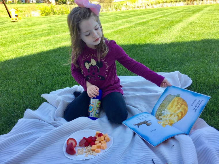 Outdoor Picnic Lunch– What a delight it was to eat lunch on a blanket in our backyard. While eating. we read some favorite books and closed our eyes and listened. What sounds do you hear? (lawnmower, birds, dogs, a siren). The ability to differentiate sounds is the beginning tier of phonological awareness, an umbrella term that incorporates phonemic awareness (differentiating sounds) and a range of oral language skills necessary for reading and writing development.
