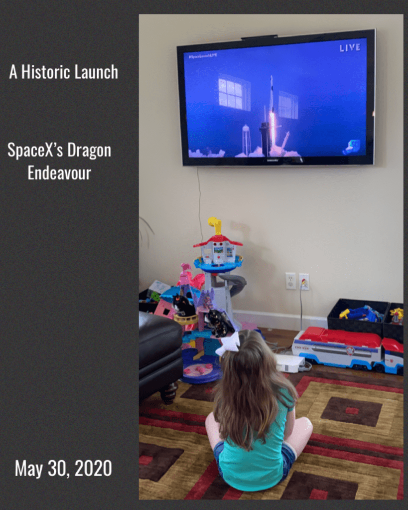On Saturday afternoon my family of three gathered around the TV and watched a historic event. On May 30, 2020, we witnessed the first launch of NASA astronauts on American soil since the Space Shuttle retired in 2011 and the first private company (SpaceX) to launch people into orbit. SpaceX’s Dragon Endeavour spacecraft, crewed by astronauts Doug Hurley and Bob Behnken, successfully launched from a SpaceX Falcon 9 Rocket at the Kennedy Space Center in Cape Canaveral, FL, with plans to dock with the International Space Station.
