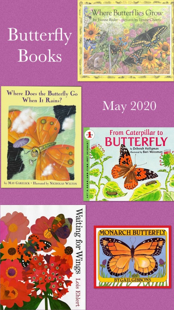 Butterfly Books– On a rainy day this week my daughter and I snuggled together and read butterfly books. We enjoyed Where Does the Butterfly Go When it Rains? by May Garelick and the book prompted some on-line research to find the answer. We also enjoyed reading Where Butterflies Grow by Joanne Ryder and Waiting For Wings  by Louis Ehlert. I found a website called , The Butterfly Lady, that describes many wonderful butterfly books to share with your little one. We read several on the list. CLICK HERE to view the list. The Scholastic Learn At Home resources are fantastic! CLICK HERE to view the one on butterflies!