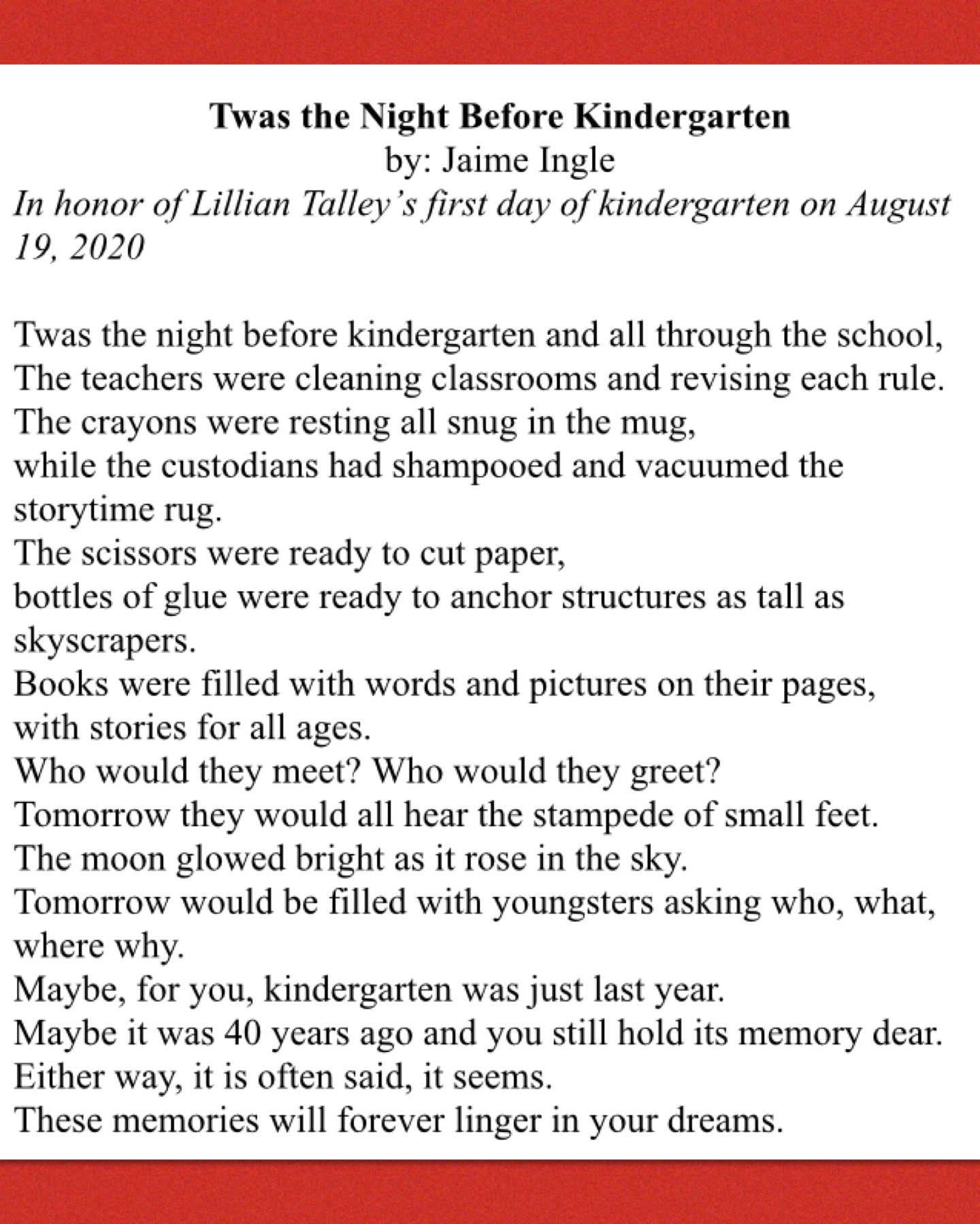 I picked my daughter up from school at 11:30 (prior to COVID-19 we had signed her up for half-day kindergarten to start out) and she excitedly shared everything she had done. She described all of the things I would expect to see and hear in a kindergarten classroom on the very first day of school. From singing the days of the week (Adams Family version I figured out) to counting the days they have been in school to singing “Tall Voices on the Playground, Small Voices Inside,” to reading books (she scolded me for reading most of them to her already), to finding her spot on the carpet (she informed me some spots may change because people talked when they shouldn’t) to talking about Jesus, I could tell she going to have a fabulous year! By sharing these intimate details of her first day of kindergarten my sweet daughter had unknowingly presented me with a very precious gift!