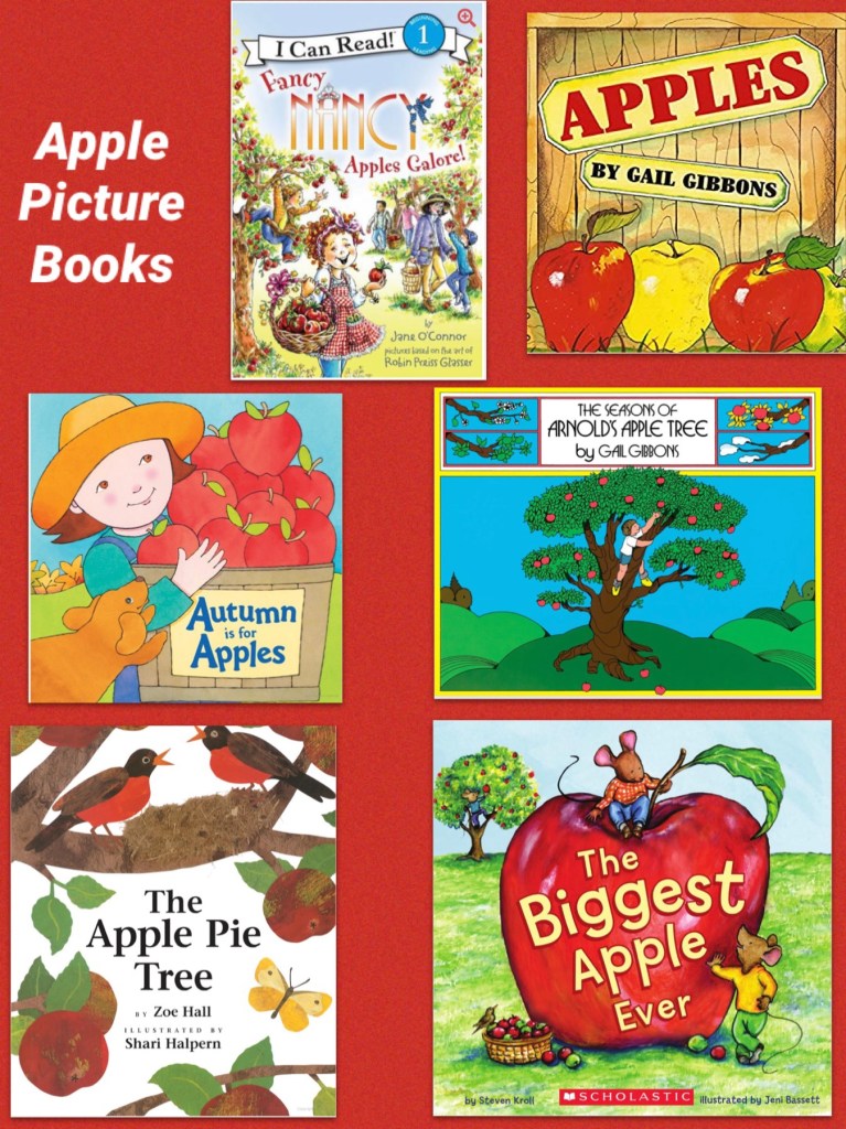 Apple Books– To prepare for our day at the apple orchard we read some books at home and my daughter’s kindergarten teacher read some Apple Books at school. These are just a few of the many great Apple Books we read this autumn. Fancy Nancy Apples Galore! was new to us but my daughter loved it because she loves anything and everything Fancy Nancy! Autumn is for Apples was another new read and was perfect for preschool and kindergarten students. Apples and The Seasons of Arnold’s Apple Tree by Gail Gibbons are classics and good informal texts. The Apple Pie Tree and The Biggest Apple Ever are fall time favorites!