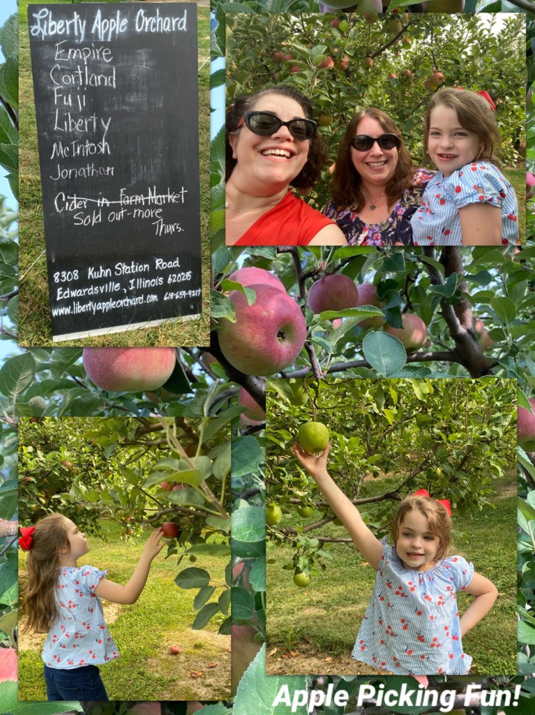 Apple Picking- This year we went to Liberty Orchard, a small apple orchard in Edwardsville, IL not too far from St. Louis, MO. Liberty Orchard had nine different varieties of apples ready for picking on the day we visited and we enjoyed some of each! While at the apple orchard we picked green apples, yellow apples and red apples. We talked about how each variety tasted (sweet, tart, sour, crunchy, crisp, juicy). The orchard educated us on the many varieties and made recommendations on which apples were best for baking. We tasted the following: EMPIRE: Crisp, juicy, tart off the tree – mellows with storage. Chosen by McDonalds for their Happy Meal. Uses: Eating, sauce, pies, baking and salads JONATHAN: Sweet/tart with firm texture. Bright red color Uses: Eating, baking – an apple butter favorite. LIBERTY: Fine textured, crisp and juicy. Rich complex flavor. Uses: Eating, pies, sauces.