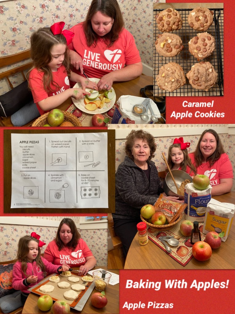 Caramel Apple Cookies and Apple Pizza– This year my daughter decided that we should make caramel apple cookies with some of the apples we picked. I researched apple cookie recipes and combined a few to create our own Caramel Apple Cookie recipe. CLICK HERE to download the recipe. You have to try these cookies. They are amazing! They call for caramel bits, something I didn’t even know existed, although I did read some people make their own bits. This recipe tastes great with or without the caramel so you can enjoy them either way. We shared some with Lillian’s teachers and everyone thought they were simply delectable. It looks like we discovered a new fall tradition! Another activity from my book is Apple Pizza. CLICK HERE to download this easy but very tasty fall treat!