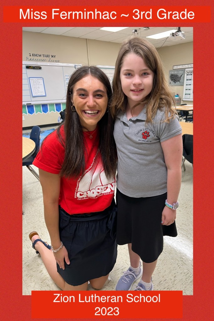 Miss Firminhac– My mini me has a young and energetic teacher this year. Miss Firminhac is new to Zion and came to us after completing two years teaching fourth grade in another state. She is a third generation Lutheran school teacher and we are thrilled to have her! The minute I met Miss Firminhac I knew she was a natural teacher. She is confident, kind and tall! What impressed me the most is how she got down on my mini me’s level and spoke directly to her in a soothing tone that eased any trepidations my mini me had about starting a new school year. With her inviting classroom and infectious smile, my “eight year old self” secretly wishes she had Miss Firminhac for a third grade teacher! I know my mini me is going to learn exponentially under the guidance of her dynamic teacher and will not only learn about the love Jesus has for His children but will be shown love by Miss Ferminhac as well.