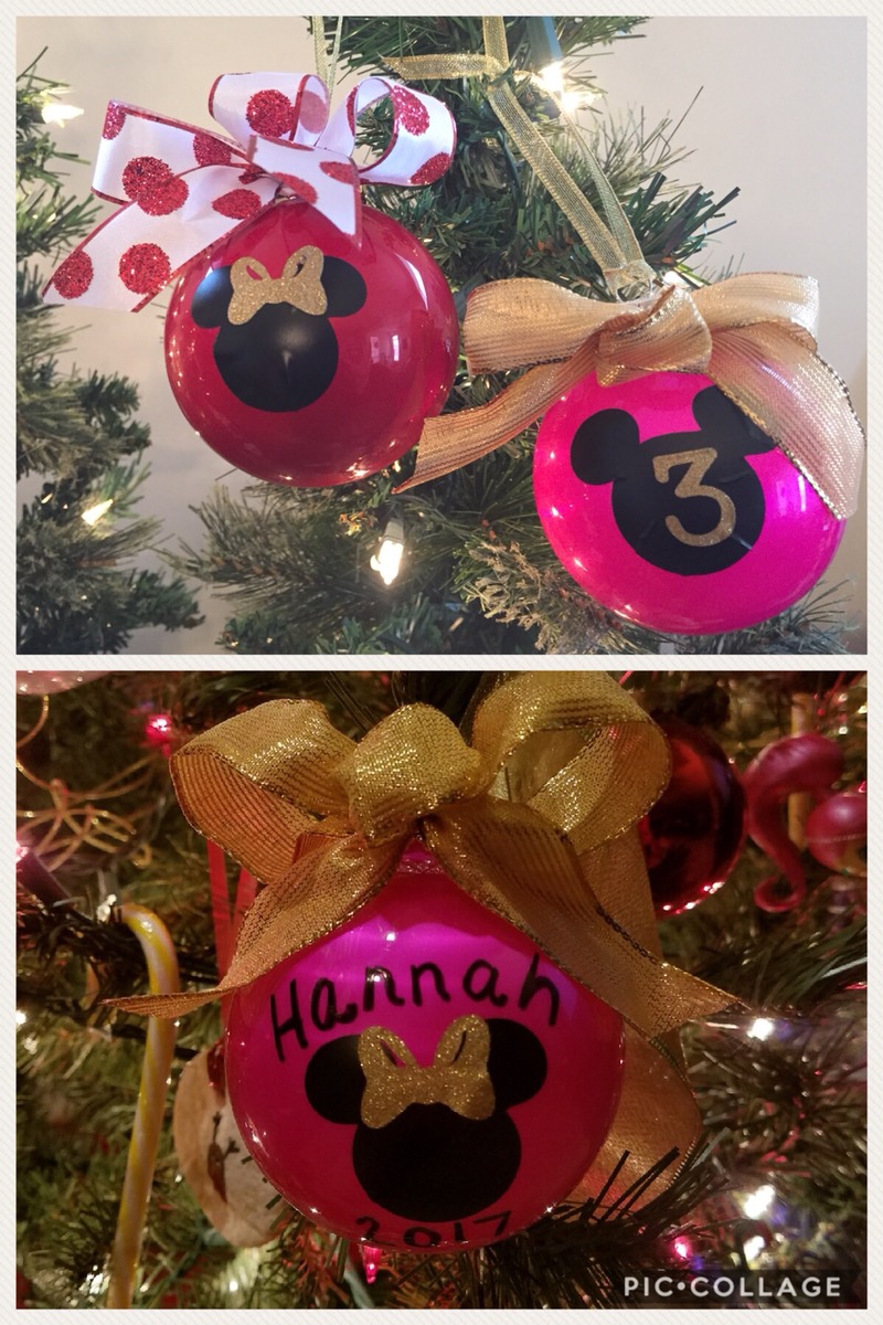 To commemorate Lillian’s Minnie Mouse birthday party, our trip to Disneyland and our magical Alaskan cruise on the Disney Wonder, we made personalized Minnie Mouse ornaments. The adults placed vinyl Minnie Mouse cutouts along with glittery bows on pink and red glass ornaments and took them home to hang on their trees.
