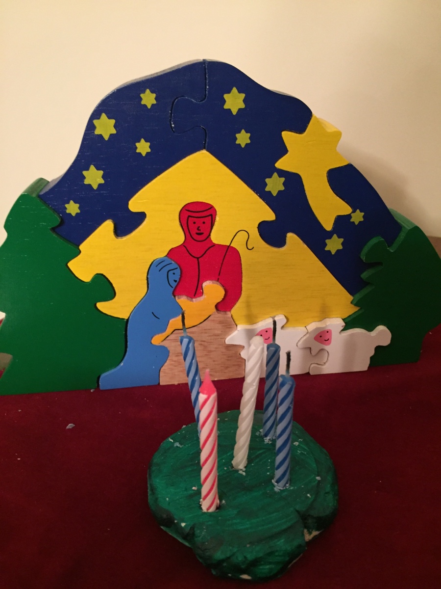 The Advent wreath we are using in our home was carefully molded out of clay by my daughter’s tiny hands. Plastered with green paint it is adorned with five skinny birthday candles. Mrs. Stanglein helped Lillian craft this Advent wreath in preschool and although simple in design it glows with radiant splendor.
