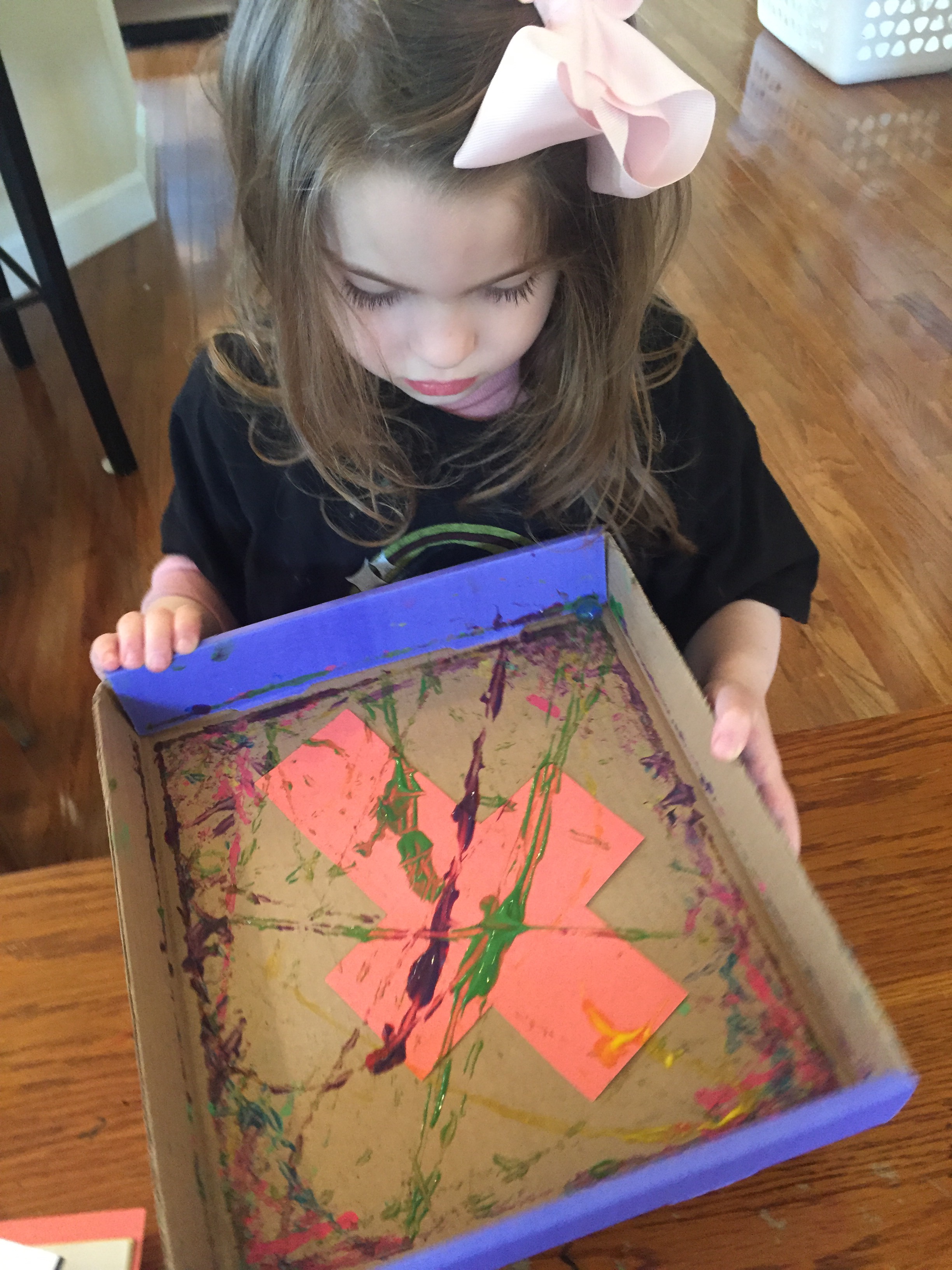 Marble Painting- We do marble painting a lot (it is one of our favorite activities). Get a shallow box (a shirt box works perfectly), paper, paint and marbles. Place the paper in the box and after coating marbles in different color paints drop them in the box and gently move the box from side to side. Make sure you practice moving the marble inside the box without paint first to set proper technique. No two masterpieces are ever alike! We painted on cross shapes but you could use any shape or canvas. (eggs, shamrocks, flowers, hearts) You can also paint with other items that roll (a toy car or small ball). The results look like miniature Jackson Pollock paintings.