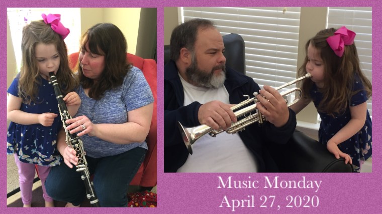 Today was Music Monday. When children sing, dance, and listen to music, they develop their language and early literacy skills while being active and encouraging movement. My family of three enjoyed making music together!