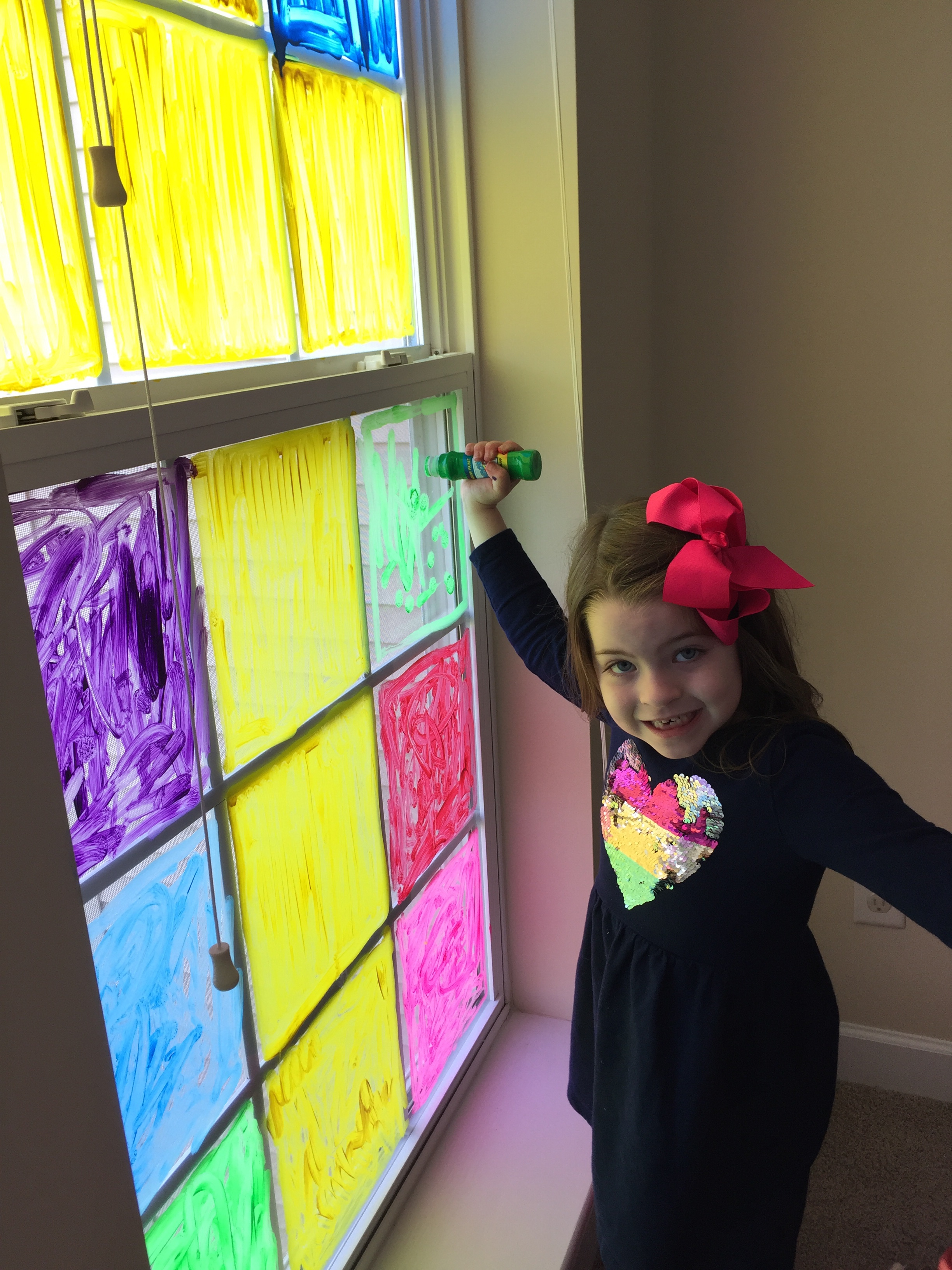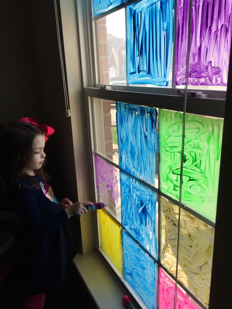 Painting– People have posted some beautiful stained glass window creations on line. We used paint dobbers designed for windows and painted stained glass crosses on several of our interior windows. My daughter really enjoyed painting and said, “Now when we have church at home our house will look like church too!”