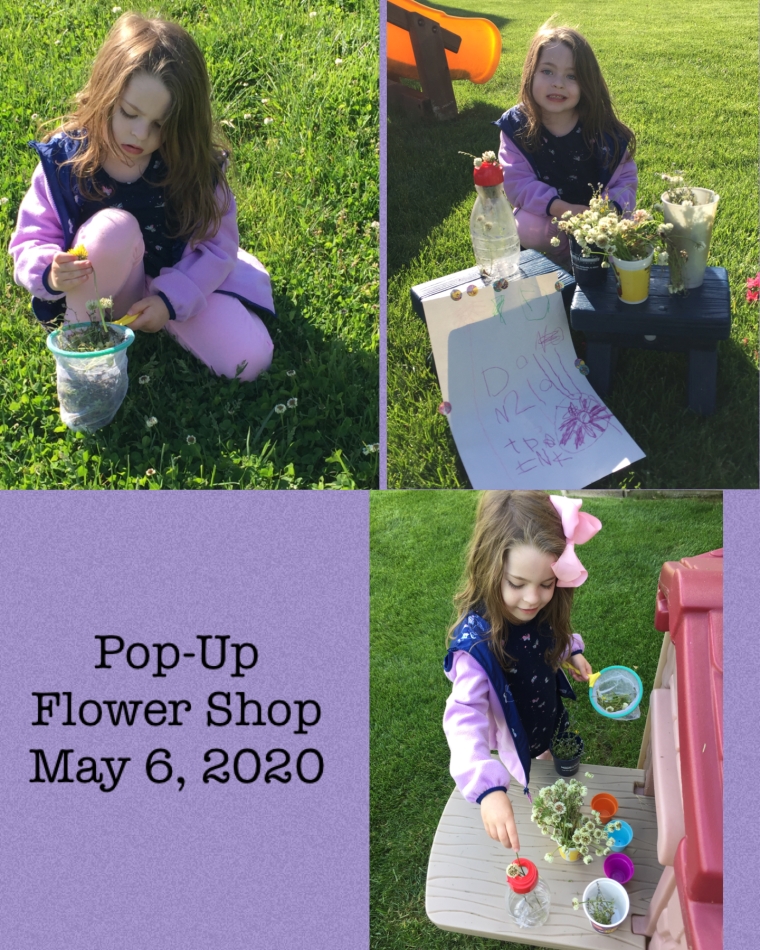 Pop-Up Flower Shop– Being an only child my daughter effectively plays independently and benefits greatly from child-directed, free play opportunities. One of her favorite places to play, during the quarantine, is in our backyard. Today she created an impromptu flower shop after gathering wildflowers in the field behind our house. She got plastic containers out of her water play toys and used them as vases. She used her toy phone to talk to customers and solicited me as her number one customer! I gladly joined in and helped direct her imaginative play. I asked the following questions…How much do the flowers cost? What is the name of her shop? Can she created mixed bouquets? I provided paper and crayons and encouraged her to create a menu for her shop, listing the prices for her various creations. By guiding her play, I was able to introduce new vocabulary and incorporate literacy skills in a fun, engaging way. CLICK HERE to read a short article about the benefits of adult guidance in play (or learning).